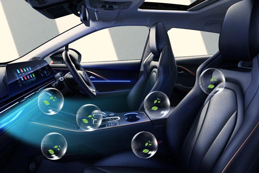 Material soft touch dan ambient light 64 warna membuat pengalaman berkendara makin menyenangkan. Selain itu, di kabinnya sudah ada AC dual zone dengan filter PM0.3 ultra-efficient untuk memastikan kualitas udara tetap bersih bagi seluruh penumpang.
